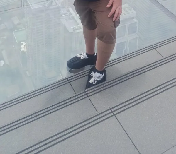 Después ya subes arriba a la terraza donde encontrarás la principal atracción del edificio, el suelo transparente. Allí te darán una funda para tus pies y ya podrás caminar por el suelo acristalado y poner a prueba tu vértigo.