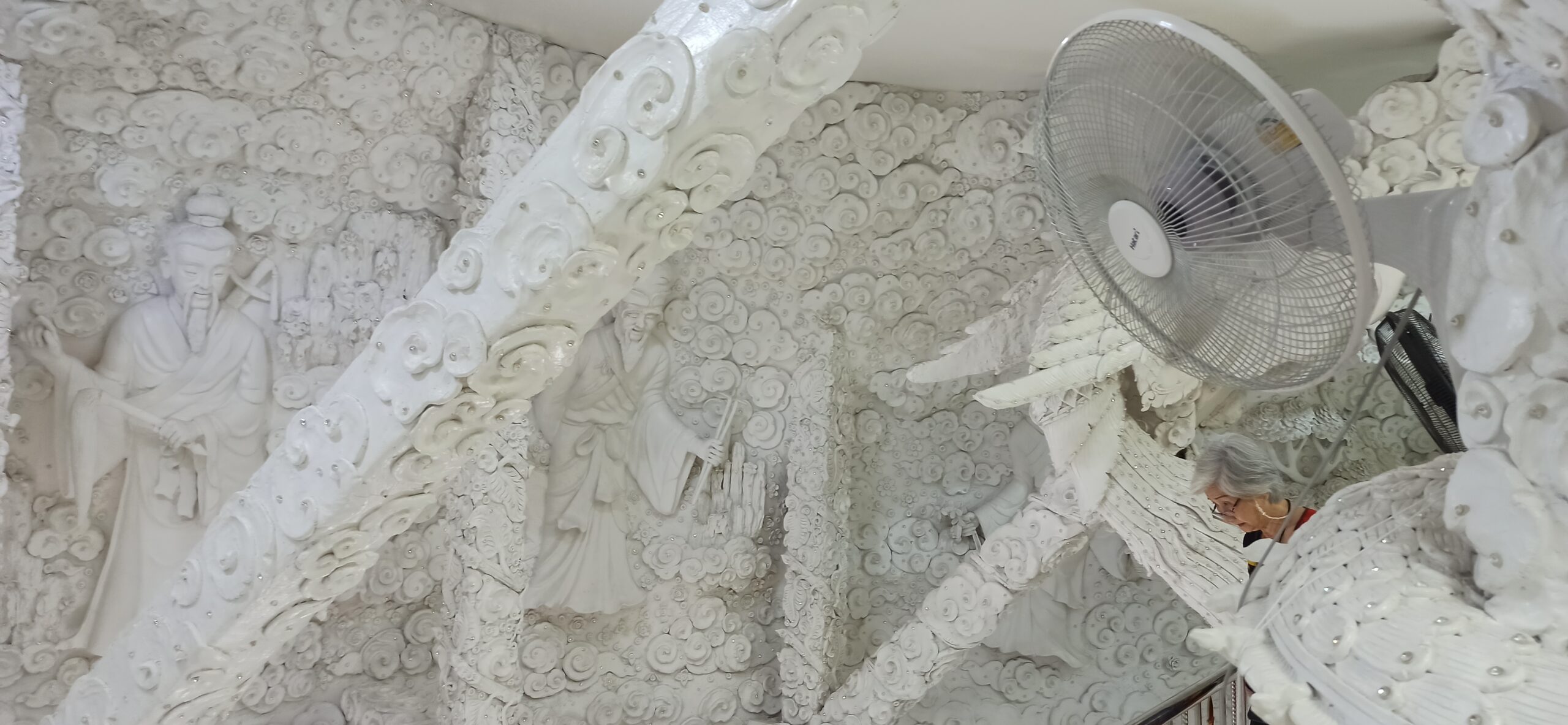 Justo antes de la entrada al círculo que hay, se representa el dolor y el sufrimiento humano con cientos de manos blancas, mientras que a medida que avanzas hacia el Ubosot, se representa la felicidad al superar todas las tentaciones y liberarse del sufrimiento humano.